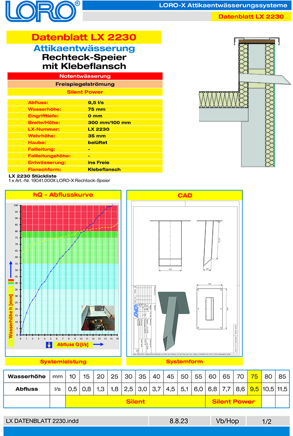 Complete System LX2230-20Xwith LORO-X rectangular spout, with bonding flange, width 300 mm, height 100 mm, proof of performance according to specification sheet LX 2230, made of stainless steel Piece list according to Datasheet LX2230-20X: